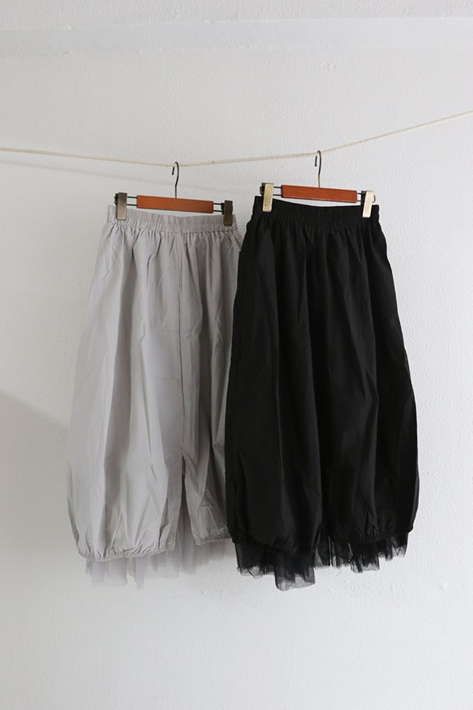 シャカシャカしたポリエステル素材に裾内側にチュールがついたスカートです。